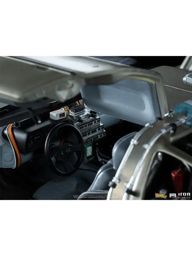 El vehículo fue replicado fielmente con todos los detalles del original, con cables, alambres y gadgets, lleno de luces internas y externas, e incluso con el llamado Mr. Fusion, que produce combustible a partir de desechos (preferiblemente orgánicos). Con una luz en su inconfundible condensador de flujo, ruedas levantadas en posición de vuelo, el vehículo se sostiene mediante una barra lateral, similar a la utilizada en la escena de la película. Por último, pero no menos importante, la puerta de gaviota abierta, que deja ver el interior del Delorean y el circuito del tiempo. El material utilizado para la producción del vehículo fue, en su mayor parte, resina, con un mínimo de piezas de plástico utilizadas en su composición. Iron Studios presenta con orgullo su primera versión en estatua del fantástico "IRON Studios: Volver Al Futuro Parte II - DeLorean Escala de Arte 1/10", que sirve de telón de fondo para este diorama.